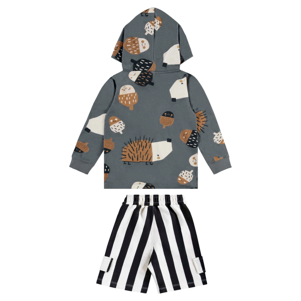 Feito em meia malha com viscose, a camiseta de manga longa possui um capuz estiloso e uma estampa exclusiva que vai encantar seu pequeno. A bermuda listrada traz um toque divertido e moderno ao look, perfeita para os momentos de brincadeira.
